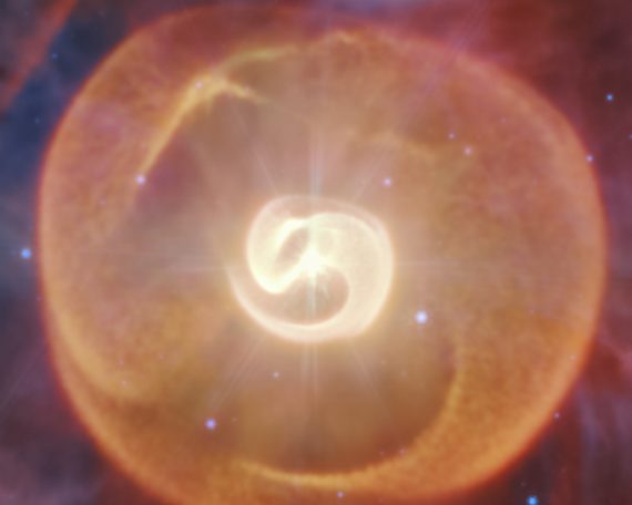 Originalveröffentlichung am 19.11.2025 zu finden unter: https://science.nasa.gov/mission/webb/latestnews/ Zusammenfassung: Forscher nutzten Webb, um die Umlaufbahn von zwei Wolf-Rayet-Sternen, benannt nach dem ägyptischen Gott des Chaos, auf 190 Jahre zu verfeinern und bestätigten, daß ein dritter Stern ihre fortwährenden Kohlenstoffstaubauswürfe verursacht Die spiralförmigen Hüllen, die von zwei Sternen, bekannt als Apep, benannt nach dem ägyptischen Gott des
