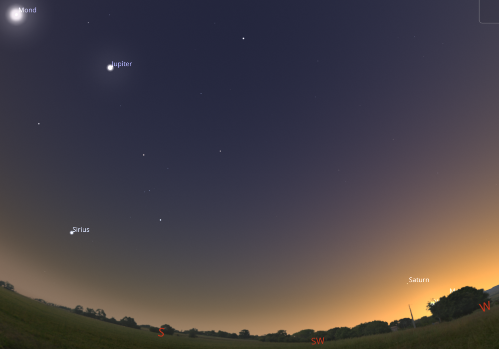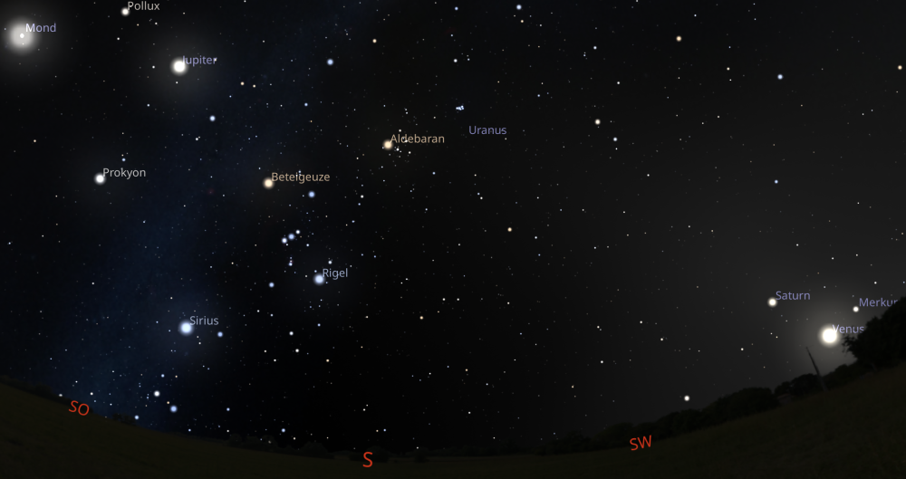 Also: Die „Planetenparade“ können Sie nicht die ganze Nacht genießen. Sie müssen schon eine Zeit lang in den Himmel schauen. Erst nach Westen, dann nach Süden.