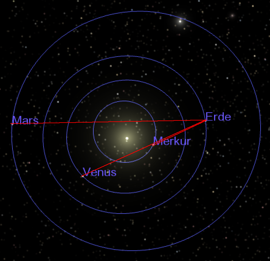 Hier ist gut zu erkennen, wie „nahe“ Merkur und Venus an der Sonne stehen. Mars übrigens auch. Während Merkur und Venus am Abendhimmel zu sehen sind, ist der Mars nur morgens ganz kurz vor Sonnenaufgang zu sehen. Das liegt am geringen Winkelabstand zur Sonne.