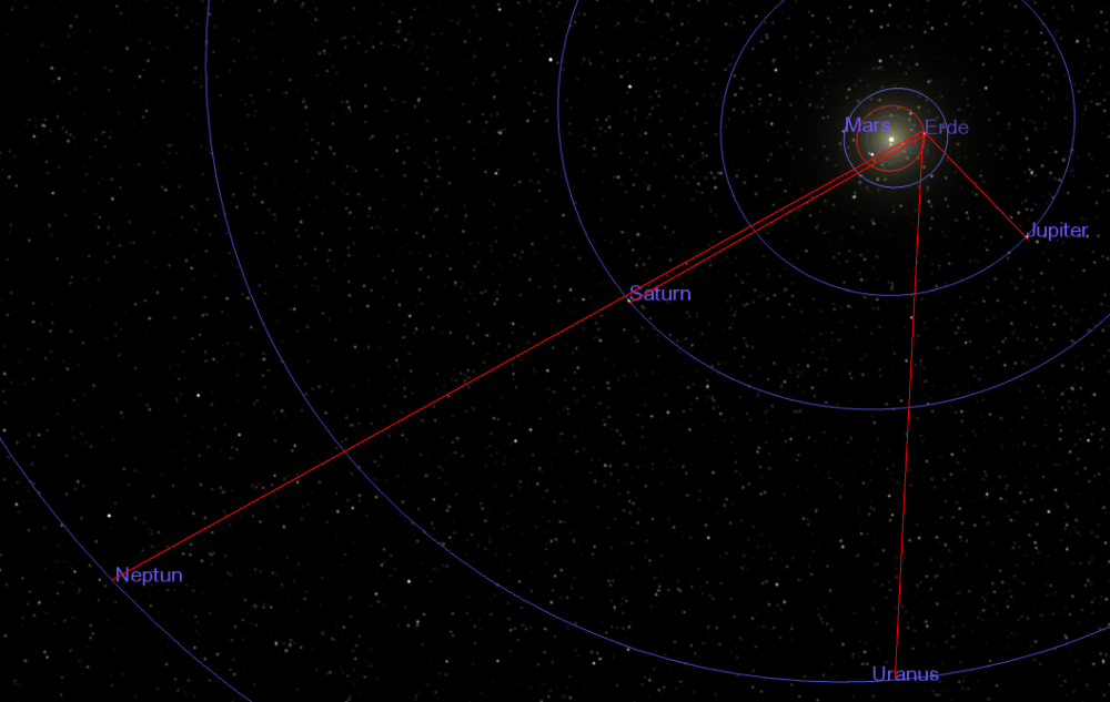 Jetzt geht’s ins äußere Sonnensystem: Die Bahn der Erde (150.000.000 km von der Sonne entfernt) ist als roter Kreis markiert. Saturn (10 mal so weit von der Sonne entfernt wie die Erde) und Neptun sind ebenfalls, was den Winkelabstand angeht, nicht weit von der Sonne entfernt. Allein Uranus und Jupiter haben einen größeren Winkelabstand zur Sonne und können fast über die ganz Nacht beobachtet werden.