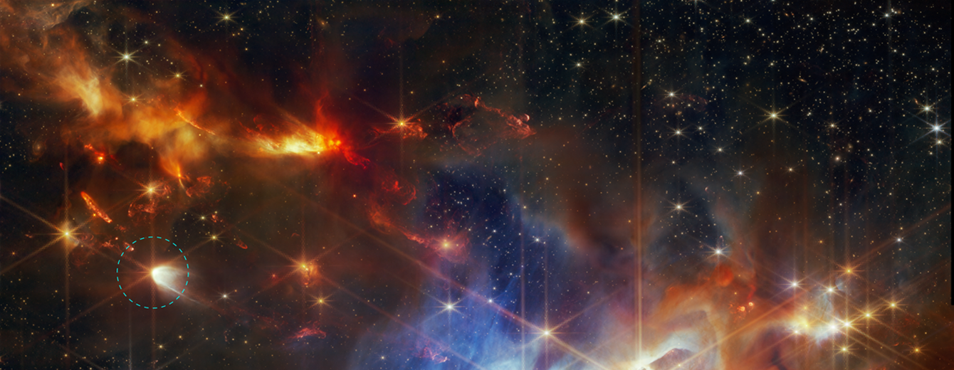 Über das Bild: Dieses Bild, aufgenommen von der NIRCam (Nahinfrarotkamera) des James-Webb-Weltraumteleskops der NASA, zeigt den sich lebhaft bildenden Protostern EC 53 (eingekreist) im Serpens-Nebel. EC 53 ist von einer protoplantaren Scheibe umgeben, in der sich möglicherweise Planeten und Kometen bilden werden. (Diese Scheibe ist aus zwei Gründen nicht leicht zu erkennen: Sie ist aus der Entfernung winzig und dunkler Staub verdeckt den Bereich.)