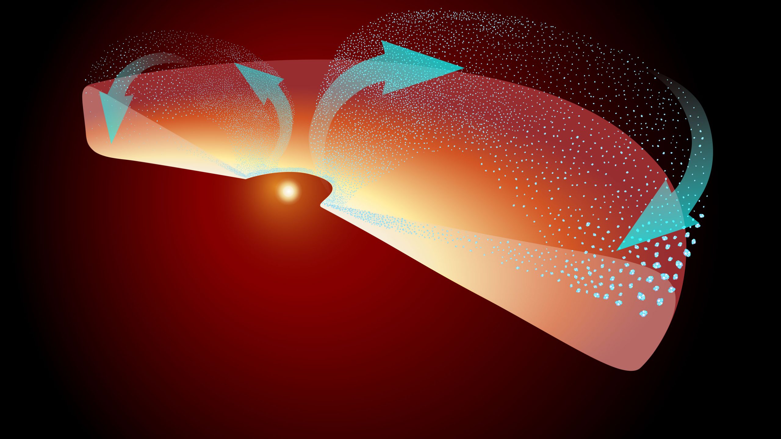 Sobald sie entstanden sind, schießen die kristallinen Silikate nach oben und außen (den blaugrünen Pfeilen folgend), angetrieben von Winden aus der Scheibe des Protosterns. Die Silikate landen oft an den Rändern des Systems, wo sich schließlich Kometen und andere eisige Gesteinskörper bilden können.