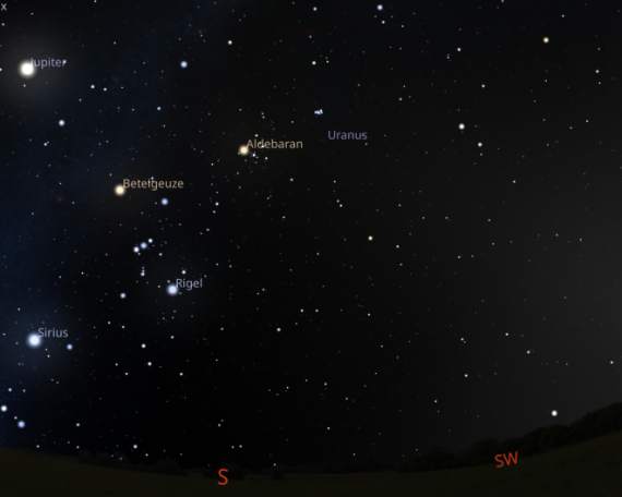Sieht das nicht toll aus? Rechts unten finden sich Merkur, Venus, Saturn – Neptun ist ganz knapp rechts vom Saturn (hier nicht zu sehen, weil zu nahe dran und zu lichtschwach). Etwas oberhalb der Bildmitte findet sich Uranus und weiter links der helle Jupiter. Und der superhelle Mond – fast Vollmond.Das ist die Planetenparade! Ich