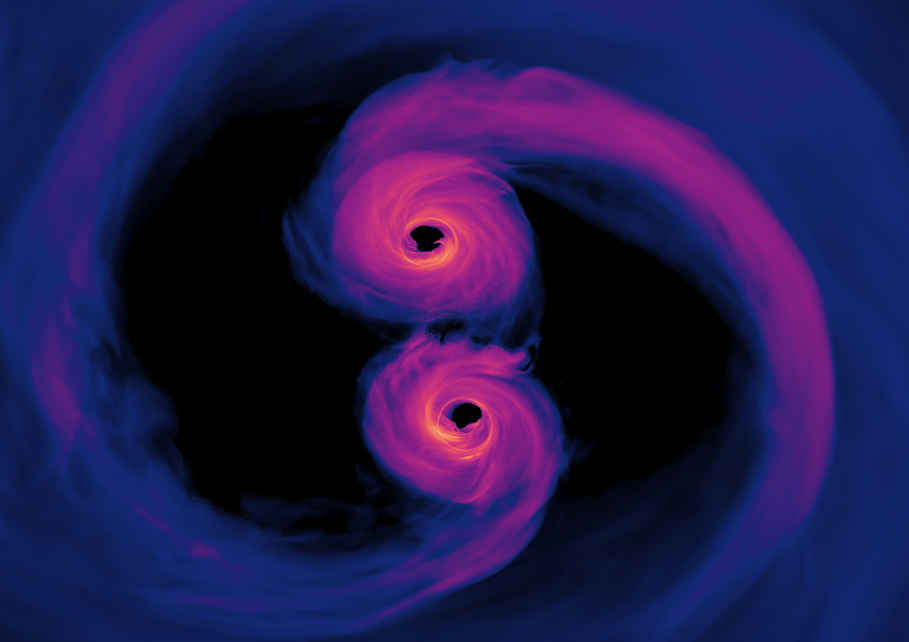 Im Laufe von hunderten Millionen Jahren nähern sich diese beiden Schwarzen Löcher immer weiter an. Letztendlich kommt es zur Verschmelzung der beiden Giganten. Dabei werden sehr starke Gravitationswellen ausgesendet – die Raumzeit selbst gerät ins Schwingen.
