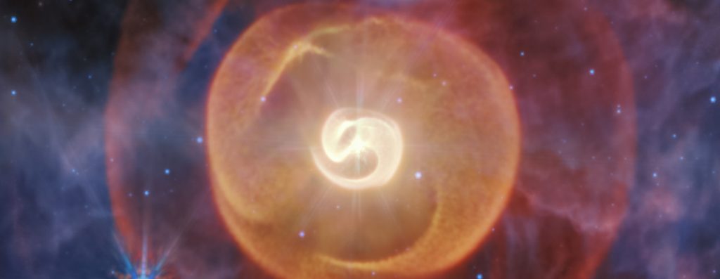 Das James-Webb-Weltraumteleskop der NASA hat eine Premiere geliefert: Ein scharfes Bild im mittleren Infrarotbereich von einem System aus vier schlangenförmigen Staubspiralen, von denen sich jede in genau dem gleichen Muster über die nächste hinaus ausdehnt. (Die vierte Spirale ist fast durchsichtig und befindet sich am Rand des Webb-Bildes.) Vor Webb wurden bei Beobachtungen nur eine Hülle entdeckt, und obwohl die Existenz weiterer Hüllen vermutet wurde, konnten diese mit bodengestützten Teleskopen nicht nachgewiesen werden. Diese Hüllen wurden in den letzten 700 Jahren von zwei alternden Wolf-Rayet-Sternen in einem System namens Apep, benannt nach dem ägyptischen Gott des Chaos, ausgestoßen.